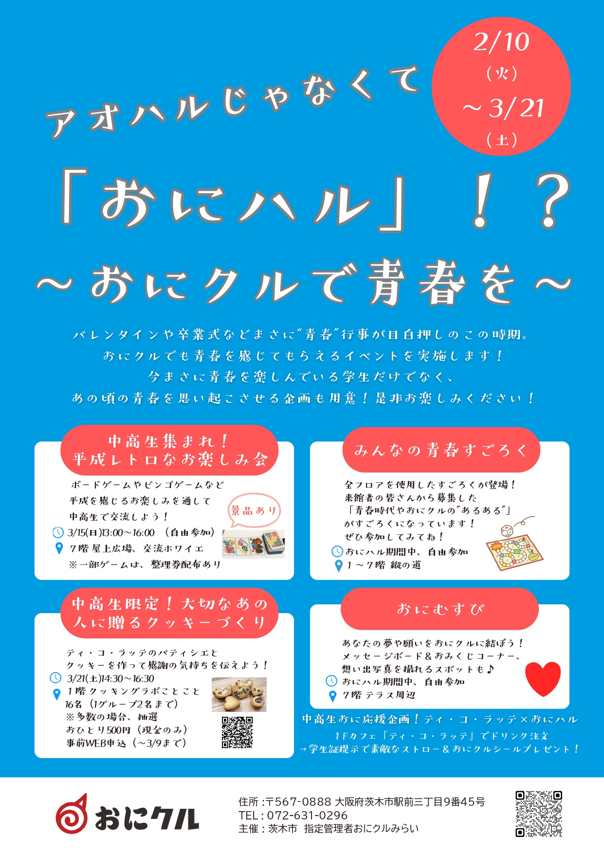 バレンタインや卒業式などまさに“青春”行事が目白押しのこの時期に、おにクル内でも青春を感じてもらうことができるイベントを実施します!